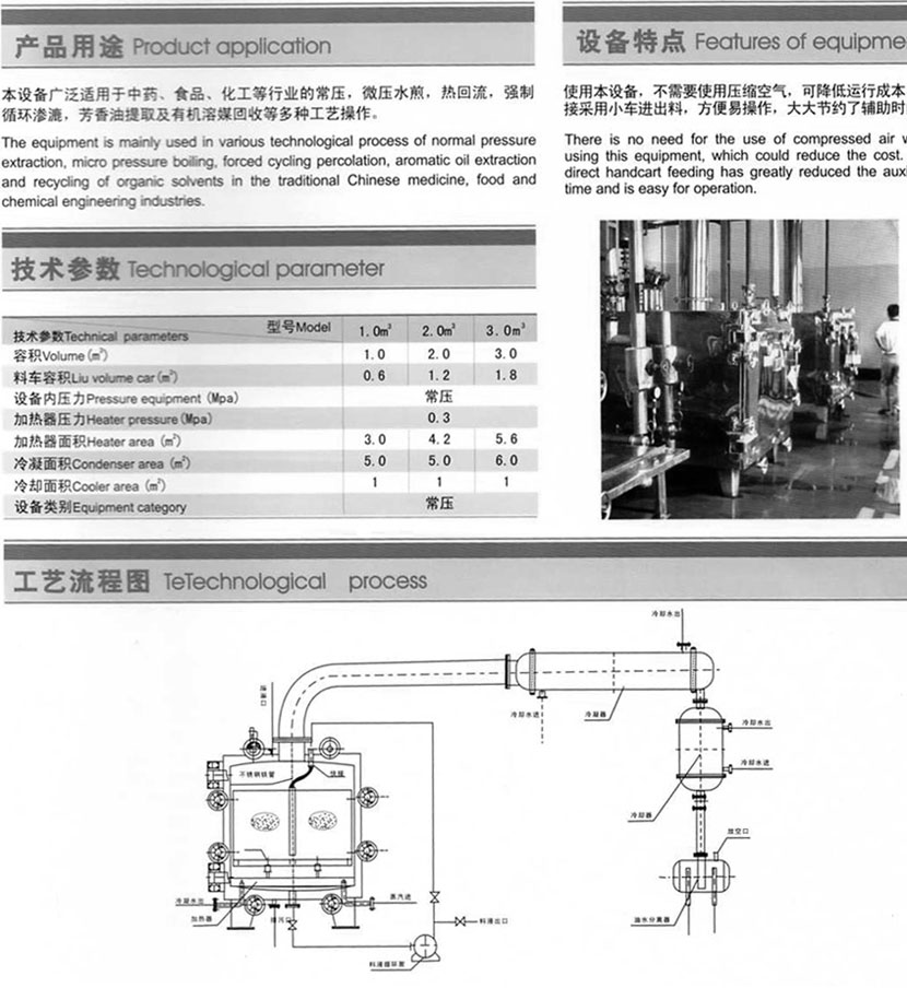 本設備廣泛適用于中藥、食品、化工等行業的常壓,微壓水煎,熱回流,強制循環滲流,芳香油提取及有機溶煤回收等多種工藝操作。