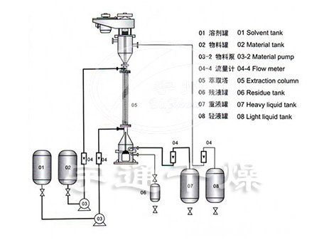 和其他塔式萃取設備一樣,工作時輕相和重相分別由塔下部和塔上部進入轉盤塔,在塔內兩相逆流接觸,在轉盤的作用下,分散相形成小液滴,增加兩液間的傳質面積,完成萃取過程的輕相和重相再分別由輕液出口和重液出口流出。