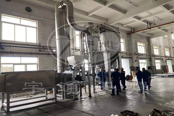 破碎是整個閃蒸干燥過程的步也是較重要的一步。被干燥的物料狀態(tài)主要是膏狀、濾餅狀。如沒有破碎就不能進(jìn)行閃蒸干燥,由此我們可以得到一個結(jié)論:黏性強(qiáng)的物料如直接使用閃蒸干燥機(jī)其干燥效果較差,需要適當(dāng)加入添加劑避免物料結(jié)塊。該過程中主要是攪拌片與高速旋轉(zhuǎn)的氣體配合完成粉碎。