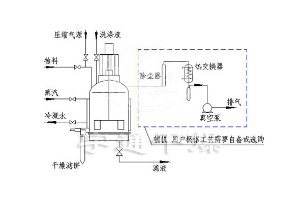 (3)吹干:充分洗滌結(jié)束后,通入壓縮空氣,對濾餅進(jìn)行吹干。需要干燥的物料,通入蒸汽或熱空氣(氮?dú)猓谡婵兆饔孟拢刮锪细稍铩?/div>