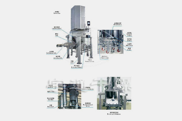GXG系列過濾洗脫干燥一體機(jī)主要由傳動部件、提升部件、洗滌部件、刮刀機(jī)構(gòu)、筒體組件、氣動裝置、濾盤、機(jī)架和相關(guān)管路及檢測控制儀器儀表等主要部件組成。