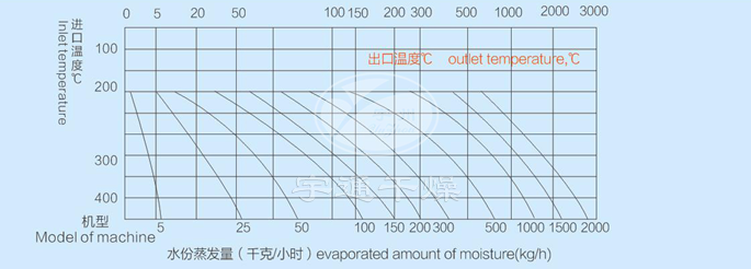 注:水份蒸發(fā)量與物料的特性及熱進(jìn)風(fēng)、出口溫度相關(guān)。當(dāng)出口溫度為90oC,其水份蒸發(fā)曲線見上圖(供選型參考),隨著產(chǎn)品不斷更新,有關(guān)參數(shù)變更,恕不預(yù)先通知。