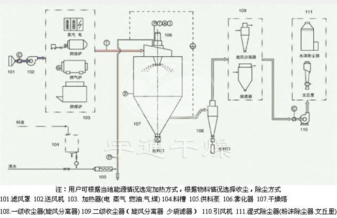 噴霧干燥機(jī)為開式循環(huán),并流式,離心式霧化。干燥介質(zhì)空氣經(jīng)過初、中效空氣過濾器過濾后根據(jù)操作指令由鼓風(fēng)機(jī)吸取再經(jīng)加熱器加熱通過過濾器的熱風(fēng)分配器進(jìn)入噴霧干燥主塔。液體物料根據(jù)操作指令經(jīng)過蠕動泵,進(jìn)入高速旋轉(zhuǎn)的離心噴頭,在離心力作用下被分散成小霧滴。在噴霧干燥主塔內(nèi),小霧滴與熱風(fēng)在充分接觸,沿其特定路徑進(jìn)行熱交換后被干燥成為產(chǎn)品,然后通過旋風(fēng)分離器實現(xiàn)分離,固體物料被收集,氣體介質(zhì)再經(jīng)過過濾后被排出。整套噴霧系統(tǒng)易清潔、無死角,符合GMP要求。