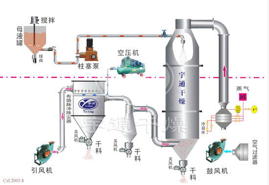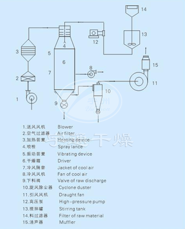 料液通過隔膜泵高壓輸入,噴出霧狀液滴,然后同熱空氣并流下降,大部分粉粒由塔底排料口收集,廢氣及其微小粉末經旋風分離器分離,廢氣由抽風機排出,粉末由設在旋風分離器下端的授粉筒收集,風機出口還可裝備二級除塵裝置,回收率在96-98%以上。