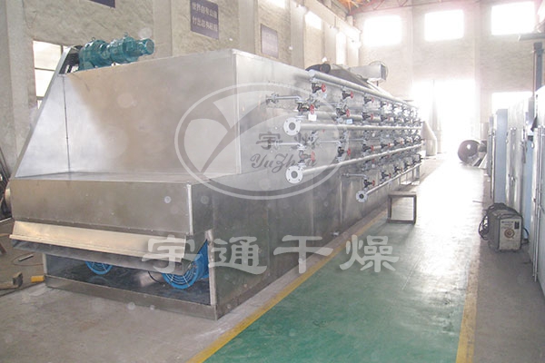 2、該系列帶式干燥機攤放到被加工物料采用多層移動式不銹鋼網帶或振動板,熱氣流自下而上穿過網帶及上的物料層,熱交換均勻、充分,生產效率高,產品的質量好,設用冷動層和旋轉輸料裝置,出料溫度低,利于及時包裝。