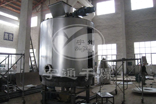 PLG系列盤式連續干燥機盤式干燥機的一層盤上,帶有耙葉的耙臂做回轉運動,使耙葉連續地翻轉物料,物料沿著指數螺旋線流過干燥盤表面,在小干燥盤上的物料移到外緣,并在外緣落到下方的大干燥盤外緣,在大干燥盤上的物料向里移動并從中間落料落入下一層小干燥盤中,大小干燥盤上下交替排列,物料得以連續地流過整個干燥機,中空的干燥盤內通入加熱介質,加熱介質從一端進入另一端導出,已干燥物料從后一層干燥盤落到殼體底層,后被耙葉移動到料口排出。蒸發出來的水蒸汽由設置在頂部的排濕口排出,夾帶的粉塵由脈沖除塵器回收,尾氣由排濕風機排出室外。底部排出的干物料可直接包裝。