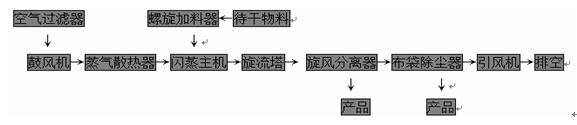 經過初、中效過濾的環境空氣由干燥系統引風機吸入熱風空氣,與蒸汽換熱后產生的熱風進入閃蒸干燥主機,與經過螺旋加料器送入干燥主機的待干燥濾餅,在干燥主機內完成傳熱傳質的干燥過程,氣固混合物由旋風分離器和布袋除塵器分離,物料被從干燥系統氣體內分離出來,排出干燥系統,尾氣由引風機排入大氣。