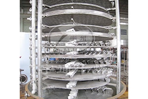 PLG系列盤式連續(xù)干燥機盤式干燥機的一層盤上,帶有耙葉的耙臂做回轉(zhuǎn)運動,使耙葉連續(xù)地翻轉(zhuǎn)物料,物料沿著指數(shù)螺旋線流過干燥盤表面,在小干燥盤上的物料移到外緣,并在外緣落到下方的大干燥盤外緣,在大干燥盤上的物料向里移動并從中間落料落入下一層小干燥盤中,大小干燥盤上下交替排列,物料得以連續(xù)地流過整個干燥機,中空的干燥盤內(nèi)通入加熱介質(zhì),加熱介質(zhì)從一端進入另一端導出,已干燥物料從后一層干燥盤落到殼體底層,后被耙葉移動到料口排出。蒸發(fā)出來的水蒸汽由設置在頂部的排濕口排出,夾帶的粉塵由脈沖除塵器回收,尾氣由排濕風機排出室外。底部排出的干物料可直接包裝。