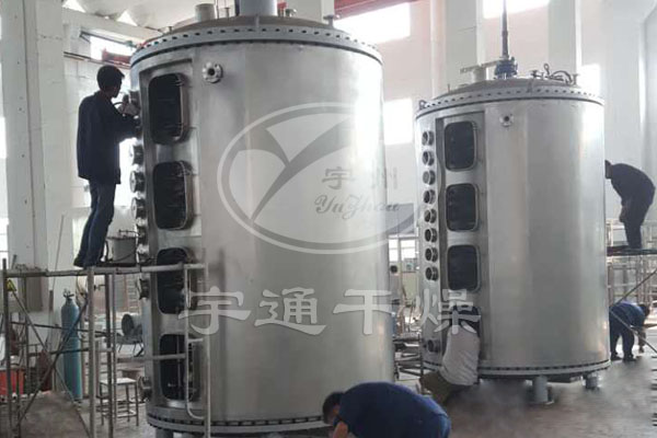 5、安裝方便、占地面積小。干燥器整體出廠,整體運輸,只需吊裝就位,安裝定位非常容易。由于干燥盤層立式布置,立式安裝,既使干燥面積很大,占地面積也很小。
