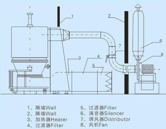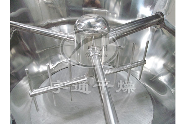 空氣經加熱凈化后,由引風機從下部導入,穿過料斗的孔網板。在工作室內,經攪拌和負壓作用形成流態化,水份快速蒸發后隨著排氣帶走,物料快速干燥。