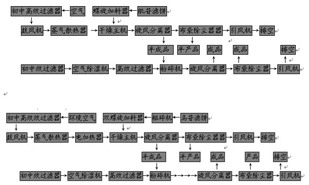 肌苷、鳥苷專用旋轉閃蒸干燥設備于肌苷與鳥苷兩種特料的干燥,干燥主機與物料接觸處均采用SUS304不銹鋼,配備了旋風+布袋除塵兩級收料,采用蒸汽與電加熱補充的熱源方式,并配有粉碎、冷卻及氣力輸送系統,采用PLC集中控制,自動化程度較高。