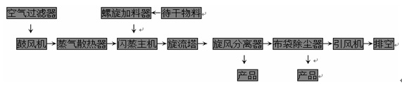 經過初、中效過濾的環境空氣由干燥系統引風機吸入熱風空氣,與蒸汽換熱后產生的熱風進入閃蒸干燥主機,與經過螺旋加料器送入干燥主機的待干燥濾餅,在干燥主機內完成傳熱傳質的干燥過程,氣固混合物由旋風分離器和布袋除塵器分離,物料被從干燥系統氣體內分離出來,排出干燥系統,尾氣由引風機排入大氣。