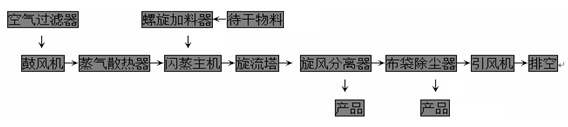 熱空氣由入口管以切線方向進入干燥室底部的環隙,并螺旋狀上升,同時,物料由加料器定量加入塔內,并與熱空氣進行充分熱交換,較大較濕的物料在攪拌器作用下被機械破碎,濕含量較低及顆粒度較小的物料隨旋轉氣流一并上升,輸送至分離器進行氣固分離,成品收集包裝,而尾氣則經除塵裝置處理后排空。
