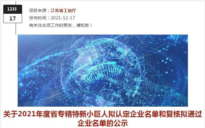 2021年12月17日,江蘇省工信廳公布了2021年度省“專精特新小巨人”擬定企業名單和復核擬通過企業名單。宇通干燥經企業申報、市縣審核推薦、形式審查、專家評審等程序成功入圍。