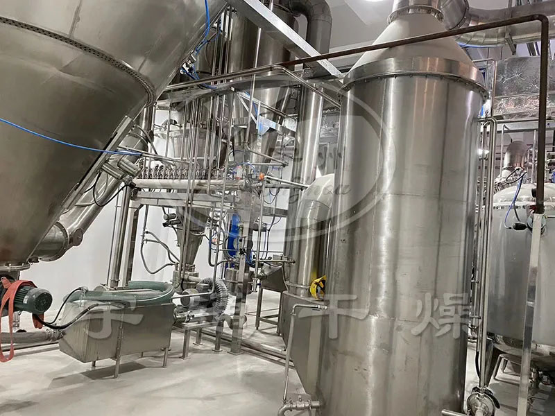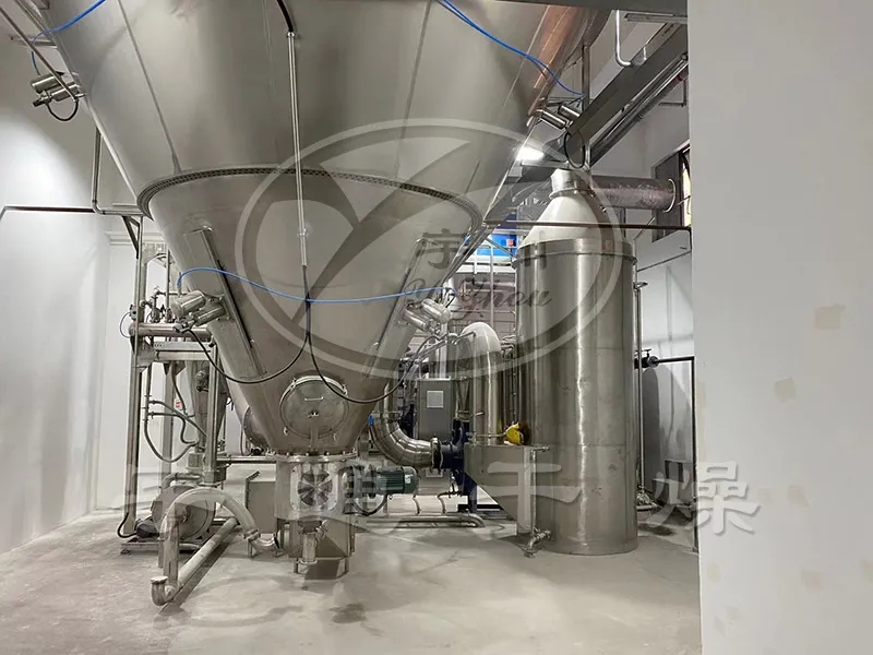 本設備研發了基于耦合流場理論、工藝參數優化和多技術耦合智能控制的干燥系統。采用氣囊密封、氣缸抖動等技術,實現了低強度和高效自動落料上料,物料充分回收,干燥和制粒效果好。頂部下噴霧、底部沸騰干粉,細化霧滴和增大密度,霧滴與干粉充分高密度接觸,產品粒度無級可調;帶粘性半濕狀霧滴顆粒細料與干粉迅速粘結成低濕度粒體,實現了無粘結劑的制粒和干燥。有機溶劑回收率99%以上,尾氣中有機溶媒100%回收利用,提高了干燥速度、品質和純度。