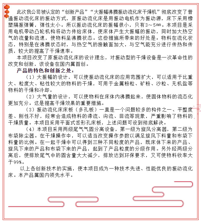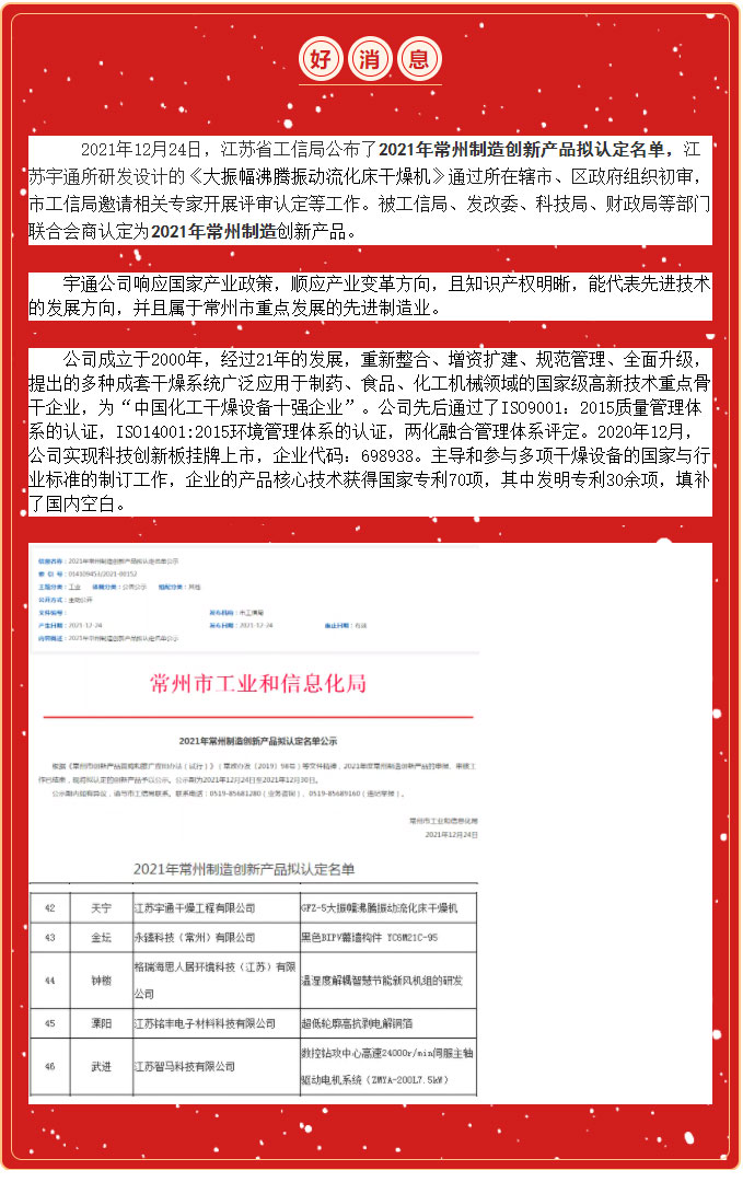 好消息!江蘇宇通所研發設計的《大振幅沸騰振動流化床干燥機》被工信局、發改委、科技局、財政局等部門聯合會商認定為常州制造創新產品。