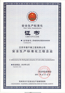 近日,江蘇宇通干燥工程有限公司通過安全生產(chǎn)標準化三級企業(yè)認證驗收,榮獲“安全生產(chǎn)標準化三級企業(yè)”證書。